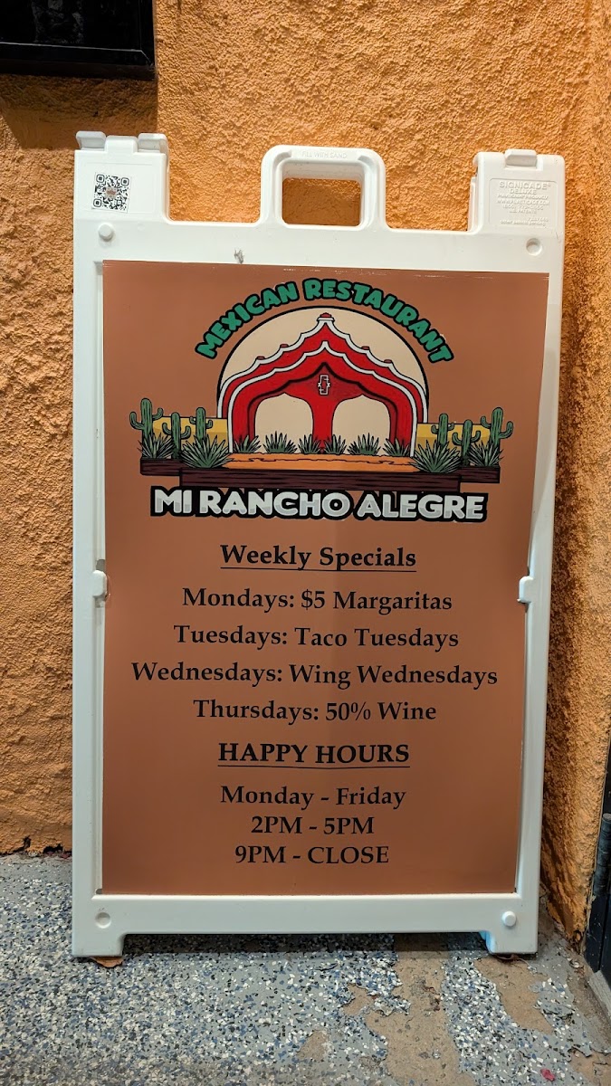 “ Meeting two friends from Albany this was the midway point. It turned out great. Hudson has lots of good looking restaurants so it was the Google review that made us pick Restaurant Mi Rancho Alegre. It’s in a strip mall with Steples right next to it. It’s nothing special from the outside. Inside it has a nice Mexican Restaurant feel. The bar is a decent size but was mostly full while we were there. We took a hightop table in the bar area. Mostly there are regular tables which allow for different size groups. As soon as we sat down chips, salsa and a bean dip was put on our table. While many Mexican restaurants give chips and salsa, the bean dip was a nice extra. We had a drink while waiting for our friends to show up. I had the Skinny Margarita but with Casamigos Reposado tequila. My wife ordered a chilled Casamigos and a glass of bubbly water and limes to mix her own Ranch Water type of drink. When our friends arrived they ordered a margarita and a cosmos. I started with a margarita and switched to a Ranch Water. My wife and I both ordered the Spinach Enchilada which we both enjoyed. Our friends shared an order of vegetarian fajitas and a side order of shrimps. We also had a large Guacamole which came with more chips. The Guacamole was excellent. Everyone enjoyed the food and drinks. We ended up there for almost three hours. The service was as excellent as the food was. Looking at Google Maps I notice that the Empire State Trail runs right behind Mi Rancho. We have walked many parts of this trail and next time will talk from here before having dinner. ”